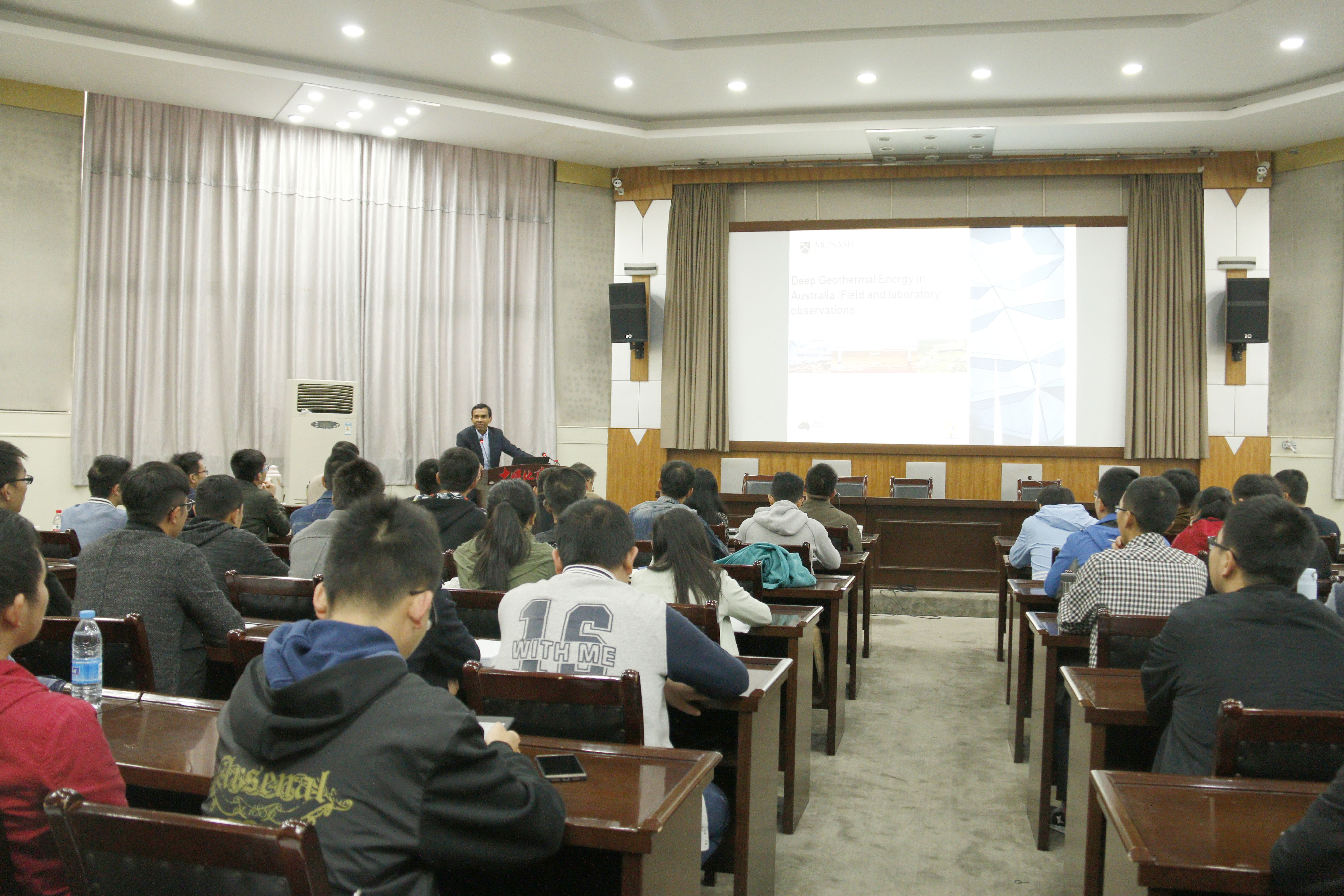 Ranjith教授从地热能发电的巨大潜力入手,介绍了一种增强型地热能源获取系统(EGSs),与传统的化石燃料相比,这种系统更加环保,是一种可再生的能源技术。Ranjith教授通过EGS系统的一些现场观测结果,对EGS系统进行了详细解析,并展示了其团队在EGS系统研究方面的最新研究进展。报告结束后,Ranjith教授热情地回答了师生的提问,他衷心希望能和我校在地热资源开发方面开展合作研究。