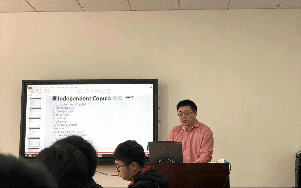 张熠副教授以One day course of Copula theory为题,介绍了Copula理论在多变量复杂相关性分析中的应用。讨论Copula理论的基本知识,包括依赖概念,模拟和估计,及将其扩展到高维模型的方法。同时进行了现场实践教学,演示了如何使用R语言编程来分析Copula问题,并对Copula理论的发展进行了展望。最后张熠教授与在场师生进行了广泛互动和积极交流。