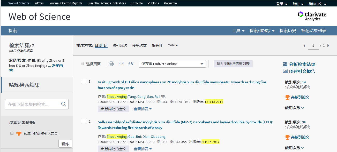基本科学指标数据库(Essential Science Indicators,简称ESI)最新数据显示,安全工程系周克清老师发表的论文“In situ growth of 0D silica nanospheres on 2D molybdenum disulfide nanosheets: Towards reducing fire hazards of epoxy resin”入选高被引论文。该论文是周克清老师以中国地质大学(武汉)开云手机平台_开云(中国)为第一单位、第一作者和通讯作者身份发表的第2篇ESI高被引论文。2018年7月周克清老师发表的论文“Self-assembly of exfoliated molybdenum disulfide (MoS2) nanosheets and layered double hydroxide (LDH): Towards reducing fire hazards of epoxy”曾同时入选ESI高被引论文和热点论文。