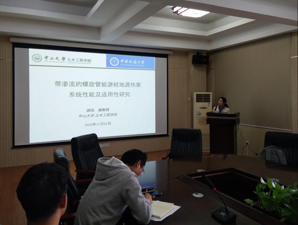 2020年11月3日下午,应开云手机平台_开云(中国)骆进副教授邀请,中山大学游田副教授作客工程文化论坛,在315会议室作了题为“带渗流的螺旋管能源桩地源热泵系统性能及其适用性研究”的学术报告。骆进副教授主持了此次论坛活动,学院50余名师生聆听了学术报告。
