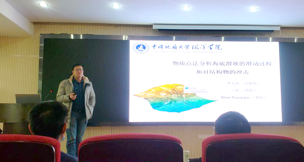 董友扣副教授以海底滑坡过程和对结构物的冲击为主题,概述了海底滑坡物理调查数据获取方法,介绍了南海白云滑坡采用多波束MBB、浅地层剖面仪SSP等监测手段,将监测手段获得的数据使用数值分析系统进行分析,强调了数值计算中网格与材料点的对应关系,重点介绍了自主研发的物质点法程序和大变形数值分析流程,展示了大规模GPU并行两相流物质点法分析软件计算速度及效率优越性,较好地再现海底地质过程的力学模拟。