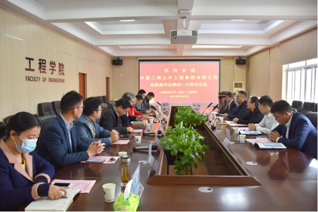 中建二局土木工程集团有限公司技术质量部高级业务经理韩鹏飞、江苏分公司新洲项目经理张智超、江苏分公司黄陂项目总工孙二龙、江苏分公司工程部副经理渠守光;中国地质大学(武汉)开云手机平台_开云(中国)安全工程系书记周克清、系主任何华刚、苗发盛副教授、胡俊杰副教授、熊峰副教授、郭良杰老师,学院科研秘书黄静等参加了此次活动。