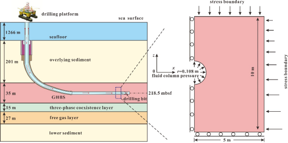 鉴于此,中国地质大学(武汉)开云手机平台_开云(中国)宁伏龙教授团队根据南海神狐海域第一次试采站位的地质资料,构建了水合物储层水平井钻进状态模型(图1)。详细研究了不同钻井液性能、水合物饱和度以及束缚水饱和度对钻进过程中井筒状态的影响规律。并在此基础上,讨论了井筒内二次水合物生成的潜在区域以及低渗泥皮形成对井壁稳定的影响。