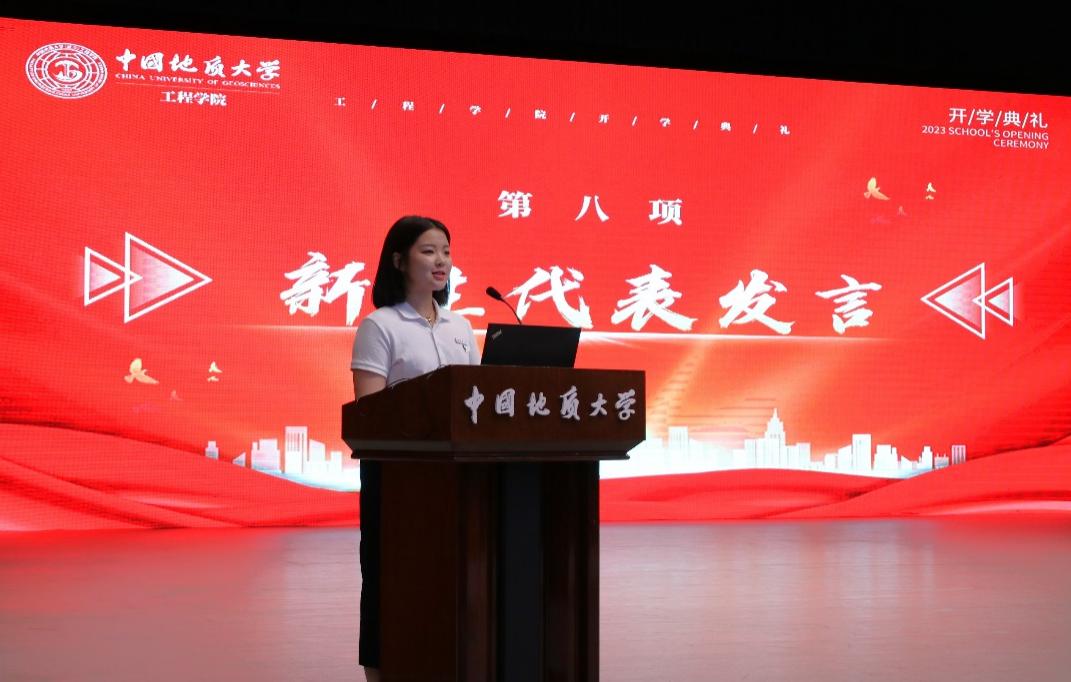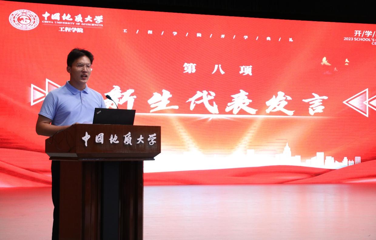 2023级05D231班张高涵同学作为本科生新生代表发言。他说,在长辈厚重岩土气息的熏陶下,自己终于如愿考进地质大学,加入开云手机平台_开云(中国)。他对开学报到以来学院领导老师给予的教育关怀表示感谢,对军事训练当中空军预警学院教官对自己坚忍毅力和良好作息的打造由衷感激,他立志与其他505名本科新生同学一道,以强国建设、民族复兴的时代号召为号角,以“品德高尚、基础厚实、专业精深、知行合一”的成才目标为向导,直挂云帆,乘风破浪,早日成为德智体美劳全面发展的中国特色社会主义事业的建设者和接班人。