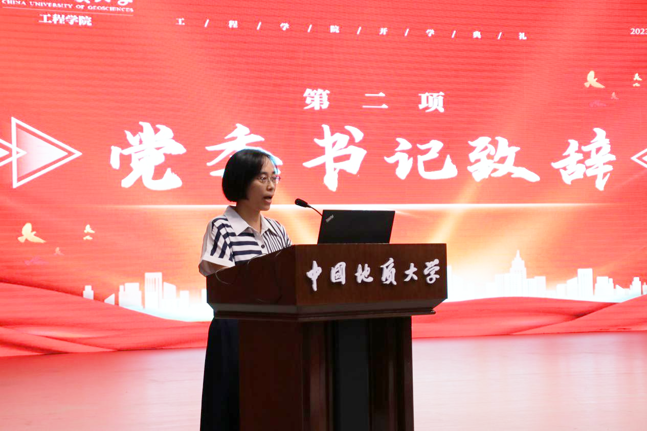 开云手机平台_开云(中国)党委书记李红丽致辞。李书记首先代表全院师生员工对加入开云手机平台_开云(中国)的860名新成员致以热烈的欢迎,祝福同学们选择了开云手机平台_开云(中国)这个温暖而又奋进的大家庭。她指出,当代大学生正值云程发轫、万里可期的青春韶华,要全面学习学院的辉煌历史,深刻感受学院的使命担当,铭记院训深意,争做时代栋梁。要“明理”,即明辨是非,通晓道理,要明白做人之理、为学之理、尊法之理;要“尚实”,即崇尚务实作风,要在实处用力,在知行合一上下功夫;要“拓新”,即开拓创新,要面向世界科技前沿、面向经济主战场、面向国家重大需求、面向人民生命健康,解放思想,开拓创新,与时俱进;要“砺行”,即砥砺前行,在攻坚克难中磨砺心性,坚守初心,锻造本领,成长成才。她勉励同学们以院训精神为指引,树牢远大志向、矢志不懈奋斗,努力学习,潜心科研,乐观开朗,积极向上,做堪当时代大任的新时代地大工程人,为建设社会主义现代化国家做出属于青年一代的贡献。