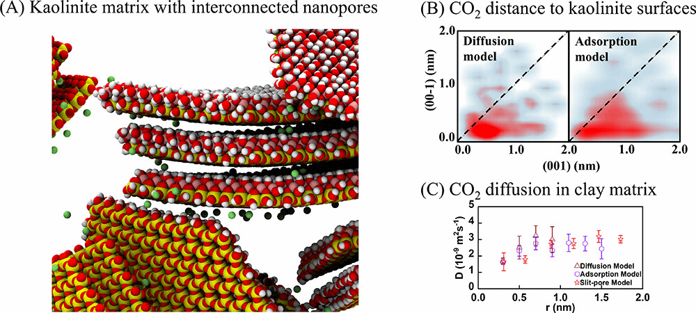 在地下储层中实施碳捕获与封存(CCS)是实现双碳战略目标的一种有效策略和措施。在封存选址阶段,虽然宏观上已经确定了储气地层的密封完整性,但从微观上看仍然存在二氧化碳扩散泄漏的可能。因此,CCS技术的成功实施,依赖于地下储层上覆盖层的特性,特别是其所富含的粘土和粘土矿物的封闭作用。高岭石是盖层中一种常见的粘土矿物,其片状结构能够形成大量介孔结构以及一些纳米级的微孔。这些相互连通、错综复杂的纳米多孔网络为二氧化碳分子扩散提供了运移空间。然而,现有的高岭石和二氧化碳体系分子模型大多数只考虑单一的狭缝结构,忽略了实际盖层中微孔网络的相互连接性,这导致我们对二氧化碳在粘土层中如何扩散和吸附理解的不够深入,极大制约了CCS技术安全高效实施和准确评价。