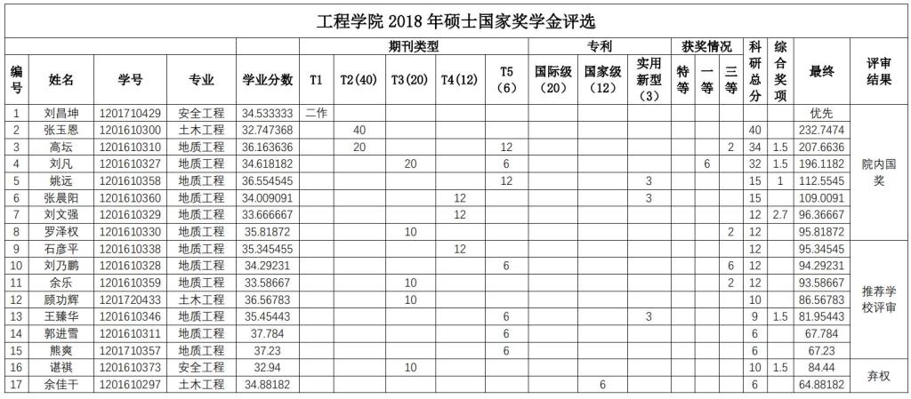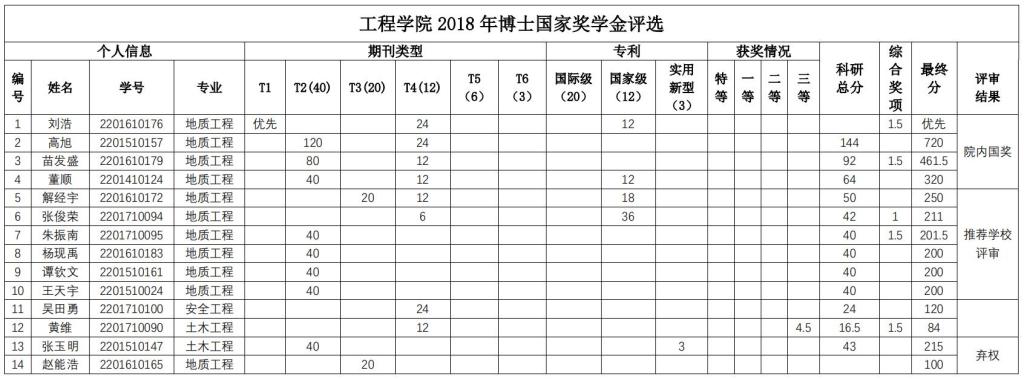 经个人申报,学院研究生国家奖学金评审委员会秘书处资格审查,学院研究生国家奖学金评审委员会于2018年9月29日下午组织通过资格审查的申报者(其中博士研究生14人,硕士研究生17人)进行答辩评审,学院研究生国家奖学金监审委员会全程监督。会议确定了刘昌坤等8名硕士研究生,刘浩等4名博士研究生为开云手机平台_开云(中国)2018 年研究生国奖学金候选人。现将开云手机平台_开云(中国) 2018 年国家奖学金候选人公示(见下表)。