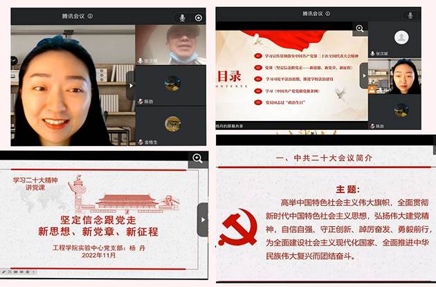 随后,支部书记杨丹同志在线上给大家上题为《坚定信念跟党走——新思想、新党章、新征程》的党课。她与大家分享了自己学习党的二十大精神的心得体会,并要求大家认真学习党的二十大精神,研习新党章修改内容及意义,在学习中自省,争做新时代合格党员教师。